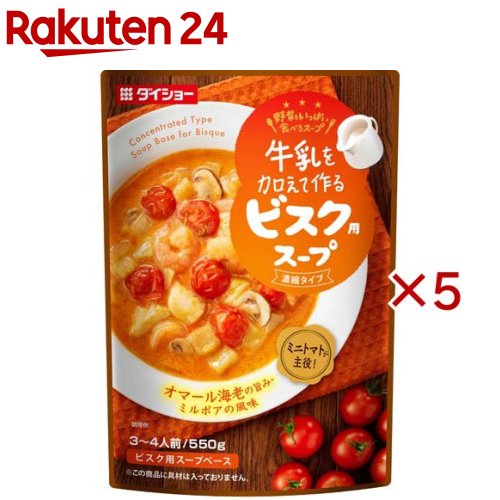 お店TOP>フード>加工食品・惣菜>スープ・シチュー>スープ全部>牛乳を加えて 野菜をいっぱい食べる ビスク用スープ (550g×5セット)【牛乳を加えて 野菜をいっぱい食べる ビスク用スープの商品詳細】●トマトペーストに、オマール海老の旨みとミルポア※の甘みが溶け込んだビスク用スープの素です。 ●ローストオニオン・ローストガーリックパウダーの風味を効かせました。 ●牛乳を加えて作るクリーミーな味わいをお楽しみください。 ※ミルポアとは、玉ねぎ・人参・セロリ等を煮込んだ甘みと風味が特徴の調味料です。 【品名・名称】ビスク用スープベース(濃縮タイプ)【牛乳を加えて 野菜をいっぱい食べる ビスク用スープの原材料】水あめ(国内製造)、トマトペースト、オマールエビエキス、食塩、大豆油、ローストオニオン、ミルポアペースト、ドライトマトエキス、ローストガーリックパウダー、酵母エキス、クリーミングパウダー/増粘剤(加工デンプン、キサンタン)、調味料(アミノ酸等)、香料、パプリカ色素、(一部にえび・乳成分・大豆・鶏肉・豚肉を含む)【栄養成分】本品1人前(157g)当たりエネルギー:53kcal、たんぱく質:0.9g、脂質:0.8g、炭水化物:10.5g、食塩相当量:2.5g【アレルギー物質】えび・乳成分・大豆・鶏肉・豚肉【保存方法】開封前は常温で保存してください。 【原産国】日本【ブランド】ダイショー【発売元、製造元、輸入元又は販売元】ダイショー※説明文は単品の内容です。 リニューアルに伴い、パッケージ・内容等予告なく変更する場合がございます。 予めご了承ください。 ・単品JAN:4904621140335ダイショー東京都墨田区亀沢1丁目17-30120-092860広告文責:楽天グループ株式会社電話:050-5577-5043[スープ/ブランド:ダイショー/] 牛乳を加えて 野菜をいっぱい食べる ビスク用スープ(550g×5セット)【ダイショー】 1,951 ~