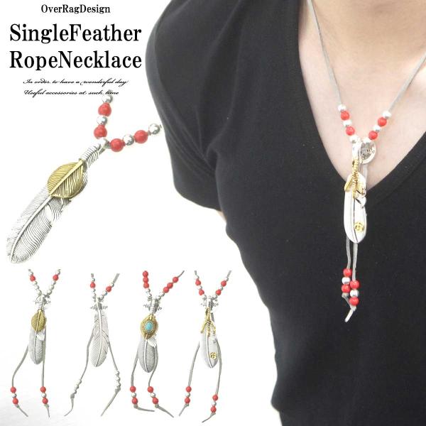 メンズネックレス ネックレス シングルフェザービーズロープネックレス フェザーネックレス フェザー イーグル ひも レザー ペア ユニセックス 誕生日
